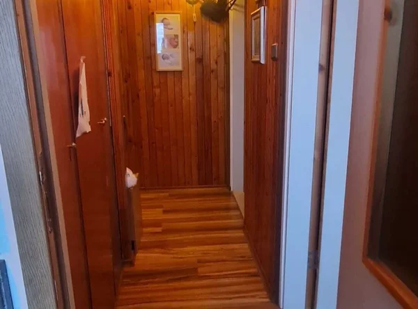 ✨ Interior primitor, cu lambriu de lemn și parchet laminat.