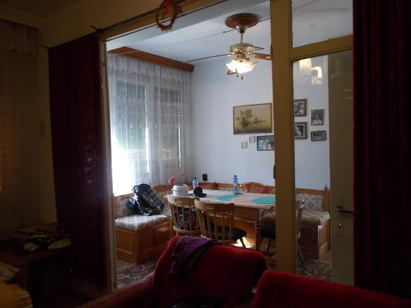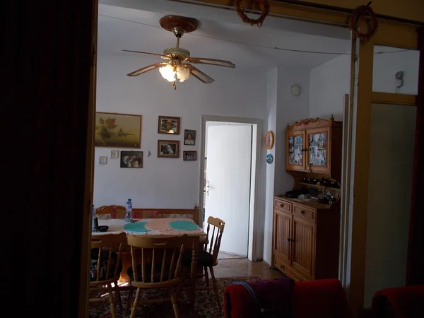 Compartimentare: bucătărie cu zonă de luat masa, salon mare, trei dormitoare, două holuri, două intrări, baie, toaletă și pivniță