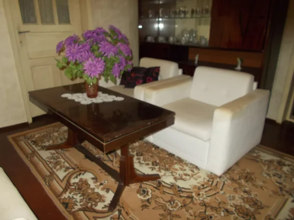 Compartimentare: bucătărie cu zonă de luat masa, salon mare, trei dormitoare, două holuri, două intrări, baie, toaletă și pivniță